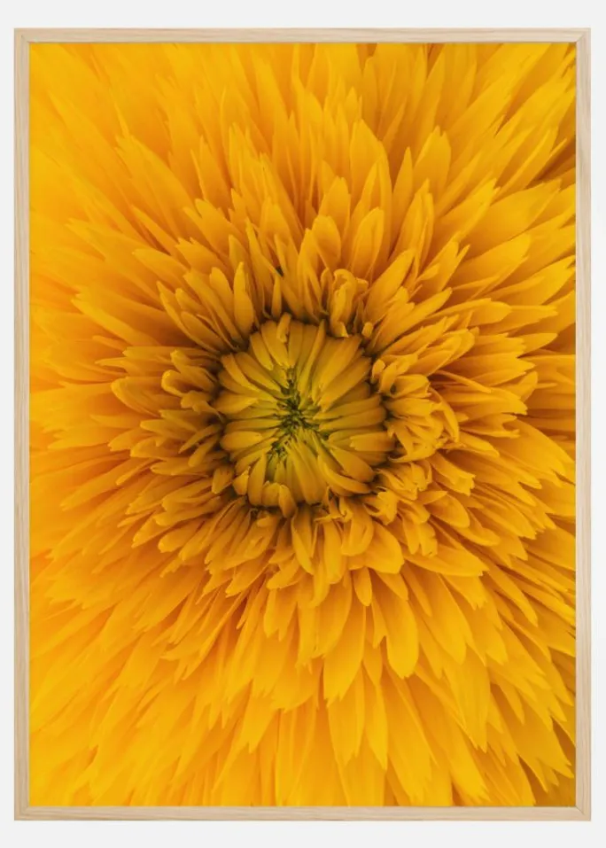 En blomstret plakat af indersiden af en lysegul blomst. Det nærgående billede af denne blomst viser alle detaljerne i de små kronblade, som de udfolder sig fra blomstens midte. Oplys ethvert rum med dette levende, glødende gule billede.