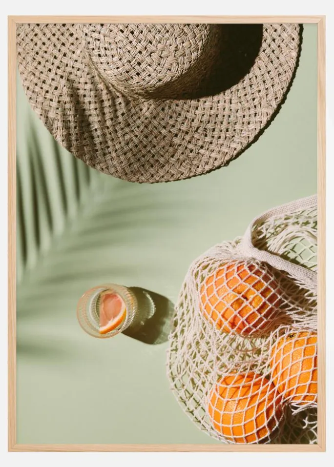 De varme toner af appelsin og de naturlige nuancer i hatten skaber en perfekt kontrast mod den milde grønne baggrund, hvilket giver et indtryk af lethed og naturlig skønhed. Denne plakat er ikke bare en dekoration; den er en påmindelse om livets enkle glæder, som at nyde frisk frugt eller mærke solen mod huden. Det er den perfekte indretningsdetalje for at skabe en afslappet atmosfære i køkkenet, på terrassen eller på ethvert sted, der har brug for et solrigt touch.