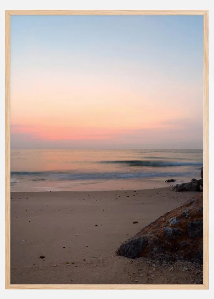 En strandplakat med en bred sandflade med det rolige hav i baggrunden. En blid solopgang titter frem over horisonten og kaster et blødt lys i lyserødt og blåt skær over havet. Få feriestemning med denne rolige og fredfyldte strandscene.