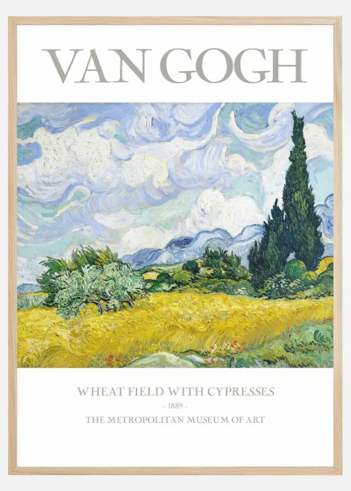 Udforsk det ikoniske billede af ro og natur med vores plakat, der fremstiller et af Vincent van Goghs mest skattede værker fra 1889. Denne plakat, ‘Wheat Field with Cypresses’, er en af hans mange malerier, der indfanger essensen af landskabet med en levende farvepalet og kraftfulde penselstrøg. I dette mesterværk ser man den plettede himmel i nuancer af blå og hvid, der spejler sig over det gyldne felt, mens mørkegrønne cypresser rejser sig mod baggrundens blødt kuperede bakker. Maleriet formidler en følelse af dynamik gennem de hvirvlende skyer og det bølgeformede græs, hvilket giver betragteren en følelse af bevægelse og frihed.
