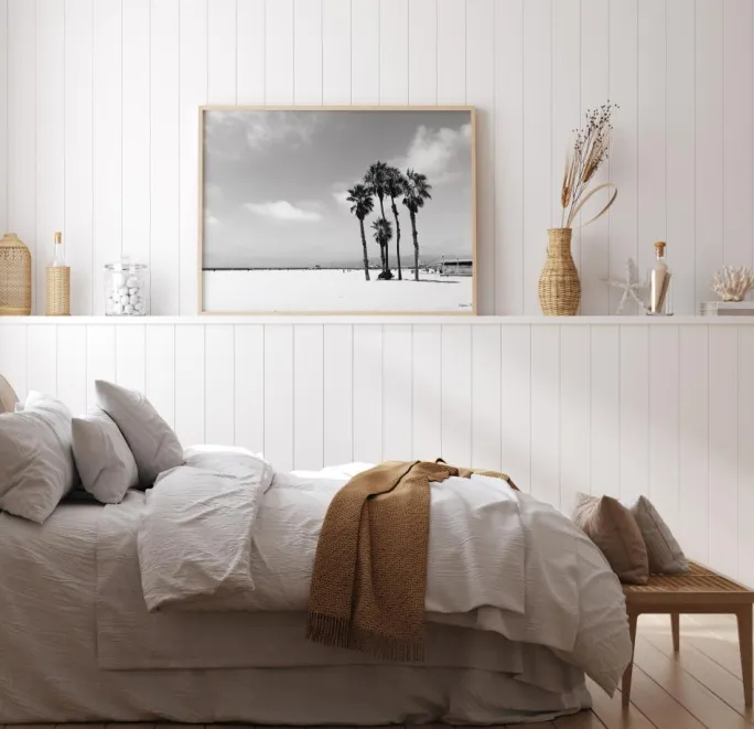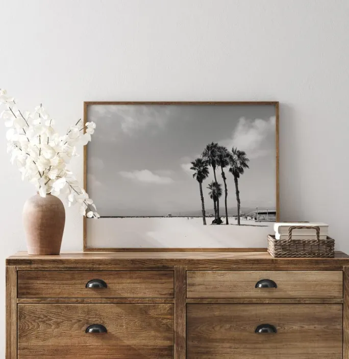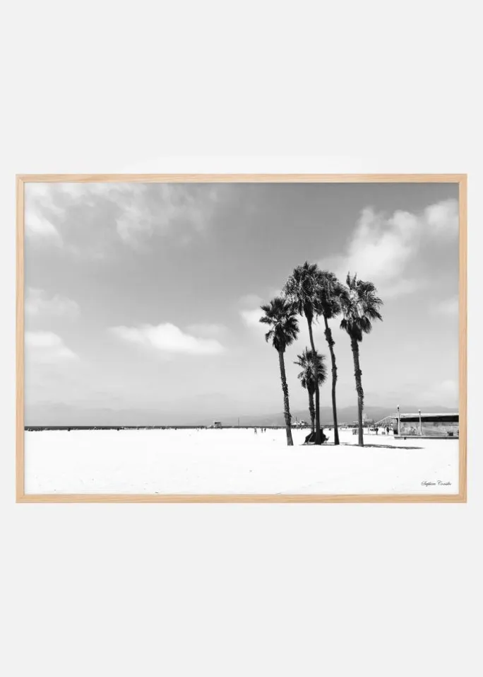 Her tager fotograf Saphira Consilio os med til den hvide strand i Venedig. Her deler menneskene pladsen med smukke palmer, forlystelsesparker og livreddernes redningstårne. En fin sort-hvid plakat i liggende format.