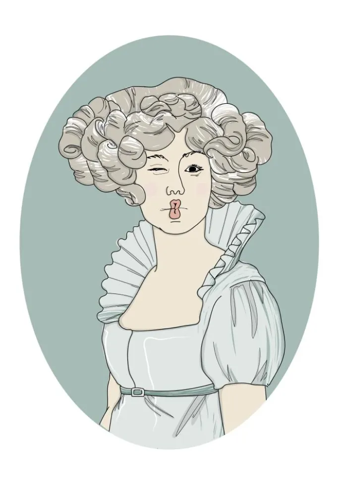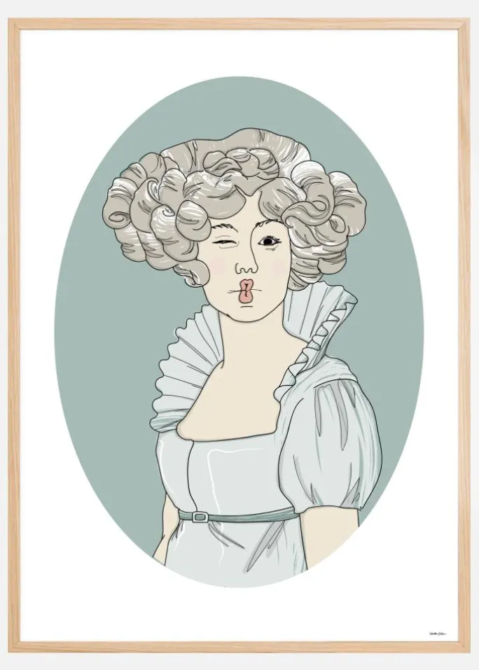 En fræk plakat af en victoriansk Violetta, som afslappet blinker ud af billedet med læberne rynket i et kys. Hendes grå krøller passer til den bløde blågrå kjole med den høje krave. Billedet er også i en blå oval for at efterligne de små medaljonbilleder fra gamle dage og skabe et unikt, finurligt kunstværk.