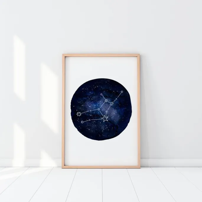 En stjernetegnsplakat af horoskopet Jomfruen. Forskellige formede og farvede cirkler fylder den hvide baggrund, som hver især er forbundet med en lige linje for at skabe stjernebilledet Jomfruen. Datoerne for dette stjernetegn er anført under billedet for at minde dig om dem.