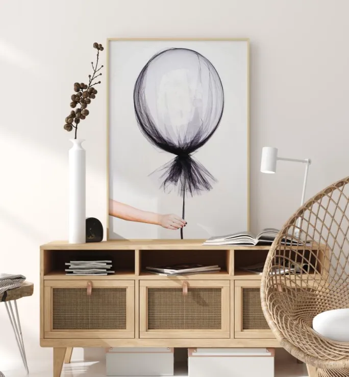 Stilren fotografisk kunst af en hånd, der holder en svævende ballon indhyllet i tyndt gennemsigtigt stof. En charmerende plakat, der udstråler en dejlig blanding af det let legende og det skrøbelige og ømfindtlige. Passer lige så godt i børneværelset som i det moderne hjem.