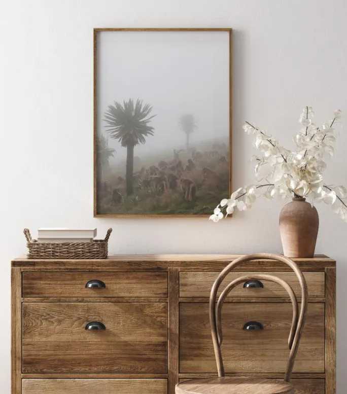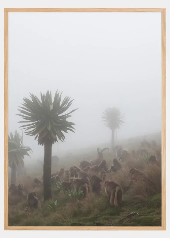 En dyreplakat af en flok geladaer med en enkelt stenbuk i midten af dem. Denne flok dyr sidder på en tåget bjergside med forskellige træer, der rækker opad. Scenen er rolig og fredfyldt, mens disse dyr tager et øjeblik for at hvile sig på dagen.