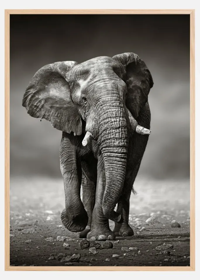En storslået plakat af en elefant i sort/hvid. Elefanten er midt i sit skridt, mens den bevæger sig mod kameraet. Den ser ung ud med korte hvide stødtænder og et roligt udtryk i ansigtet. Besøg Afrika, når du beundrer dette billede i dit hjem.