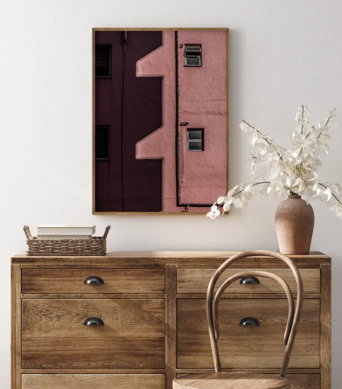 En bygningsplakat af ydersiden af en mørkerød bygning. Skygger og lys kaster mærkelige former på siden af bygningen. Vinduerne ligner øjne, der står på linje med skyggerne, der ligner næser, så billedet ser ud til at stirre direkte tilbage på dig.