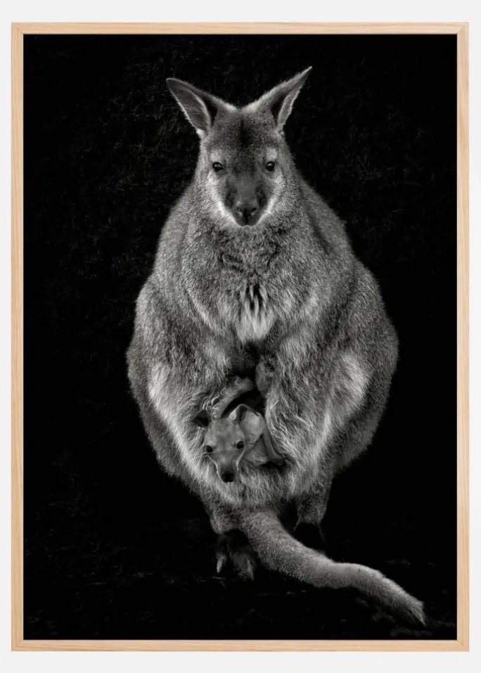 En naturplakat af en wallaby med unge. Parret skiller sig ud i et fantastisk billede mod en sort baggrund. Du får en sød, familiær følelse, når du ser på denne mor med sit barn.