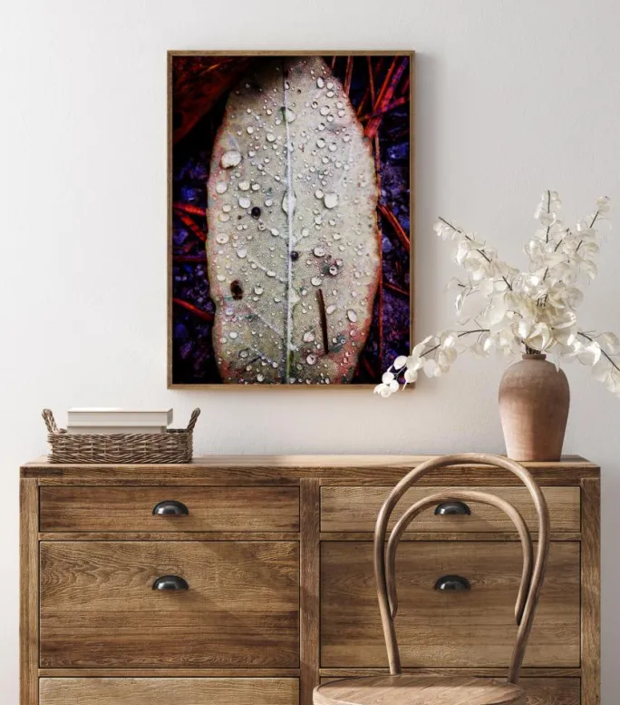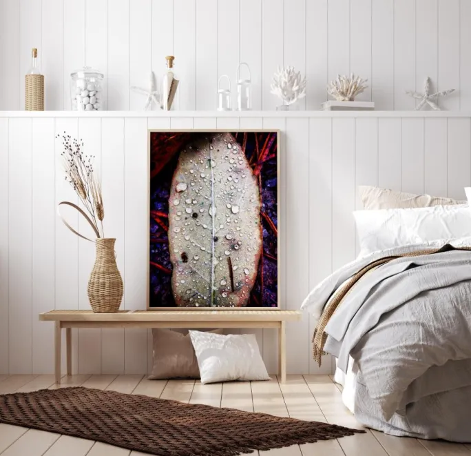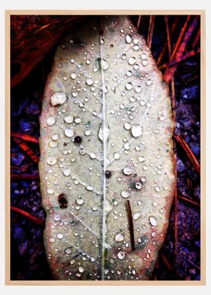 En makroplakat af et blad dækket af vanddråber. Bagsiden af bladet er lysende hvid, og ribbenene ses tydeligt. Flere regndråber dækker bladet og skaber et sjovt mønster. Omkring bladet er der lyse røde stilke og levende lilla sten, der giver dette et lyst indtryk.