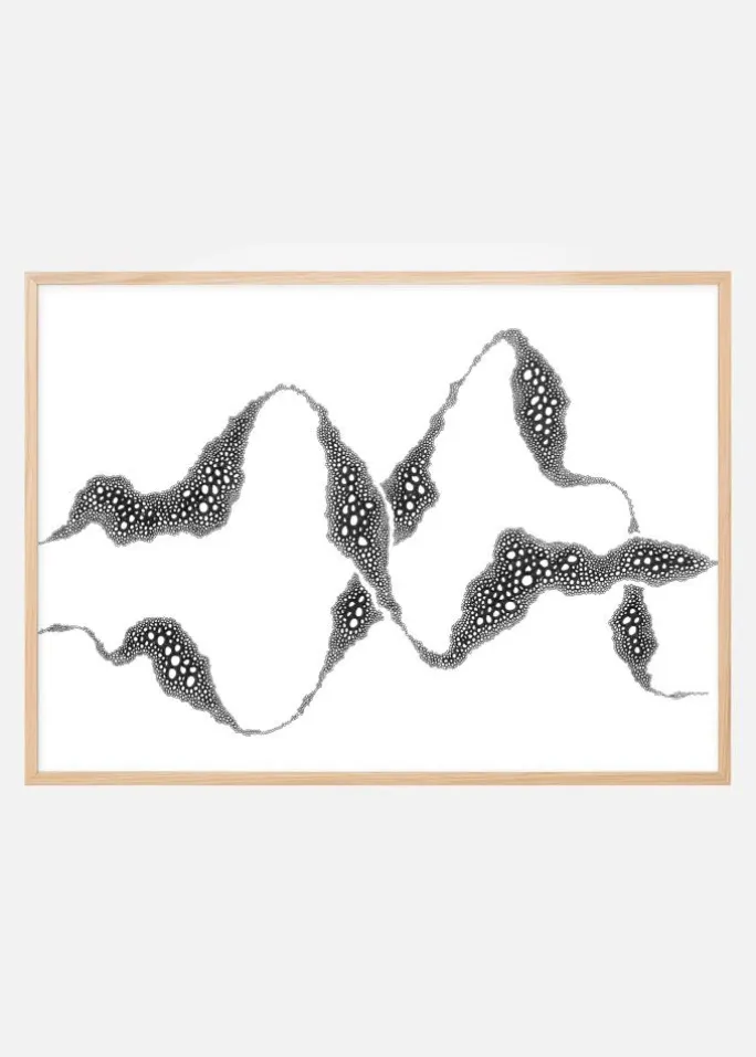 En dramatisk abstrakt plakat med forskellige sorte og hvide cirkler, der skaber mærkelige bølgende bølger på en hvid baggrund. Der er store og små cirkler som bobler, der er fastgjort til lange bølgende snore, der hvirvler og bøjer hen over billedet og krydser hinanden i dette mærkeligt fascinerende værk.