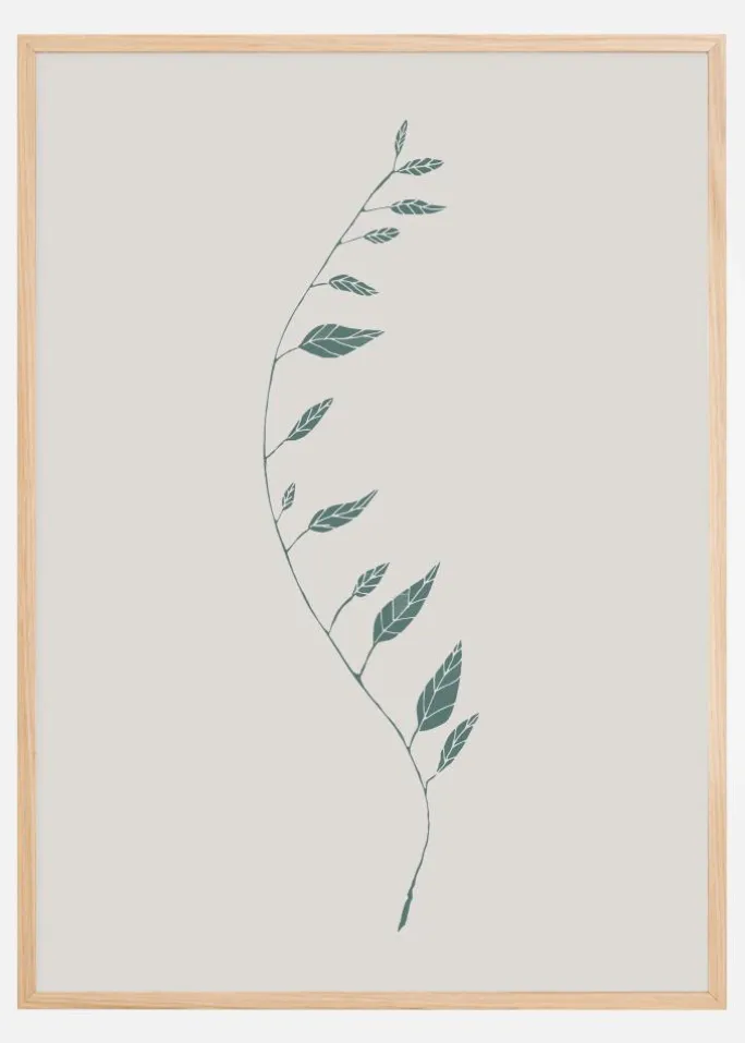 En minimalistisk plakat af en lang grøn gren, der svinger sig blidt på en hvid baggrund. Den tynde linje af grenen bølger blidt, alle bladene er på samme side, som om der er en vind der blæser dem. Dens enkelhed giver en rolig følelse, der er fantastisk til en afslappende badeværelsesstemning.