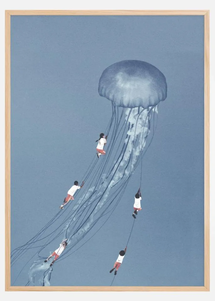 Denne poetiske og drømmende plakat viser mennesker, der gynger på tentaklerne af en gigantisk vandmand, svævende i en uendelig blå himmel. Denne fascinerende scene er en hyldest til fantasiens kraft, hvor det underbevidste og drømmeverdenen kolliderer med den vågne virkelighed. Personernes vægtløse dans med vandmanden symboliserer glæde, frihed og den uhæmmede lethed, som ofte findes i børns legende verdener.