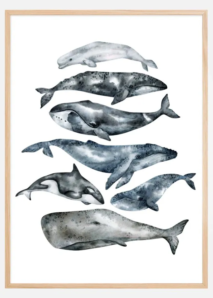 Når denne tryk pryder din væg, kan du forvente et strejf af undervandsverdenens elegance og stille styrke. Fra den legesyge delfin til den majestætiske blåhval, fanger hver figur en unik karakter og tilstedeværelse. Denne plakat er en hyldest til det marine livs mangfoldighed og skønhed, indrammet af en forfinet penselteknik, der giver liv til hver vandlevende gigant. Uanset om den placeres i en stue, et kontor eller et børneværelse, tilbyder denne tryk et inspirerende og pædagogisk glimt ind i en verden ud over overfladen, samtidig med at den komplementerer en moderne indretningsstil med sine sofistikerede grå og blå toner.