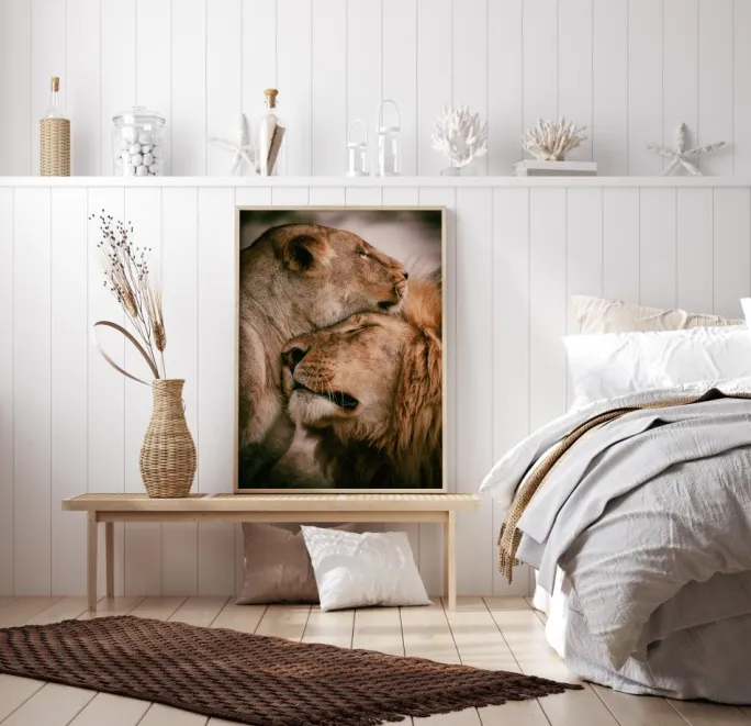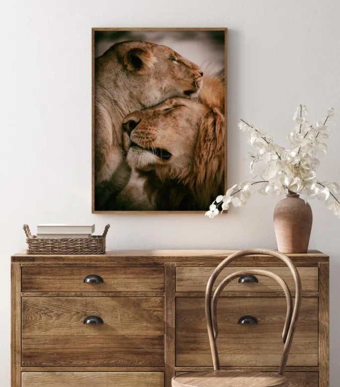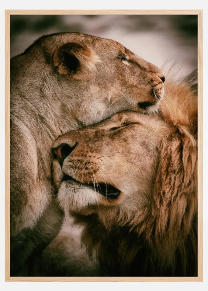 En fantastisk dyreportrætplakat af en løvinde og en løve, der krammer hinanden. De to dyr gnider deres kinder mod hinanden som et tegn på hengivenhed, mens deres øjne er lukkede i fuld tillid. Deres gyldne pels skaber en varm atmosfære. Kan du mærke kærligheden i aften?