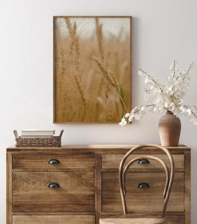 En nærbillede plakat af en hvedemark. Hvedeaksene er detaljerede i forgrunden og har en fantastisk gylden farve. De vender ud i det fjerne og viser, hvor stor denne hvedemark faktisk er. En bleg himmel er ovenover. Bring naturen ind i dit hjem med dette enkle billede.