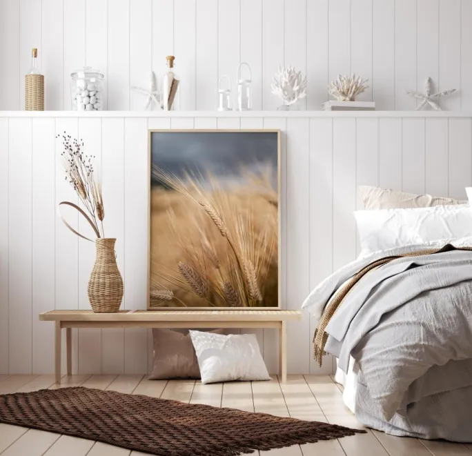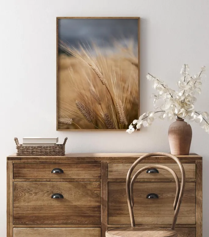 En detaljeret plakat af en hvedemark med en mørkegrå stormfuld himmel bagved. Beundr kontrasten mellem de bløde og varme hvedeår, som står skarpt af i detaljer mod de mørke skyer bagved. Nyd følelsen af forventning til den forestående storm.