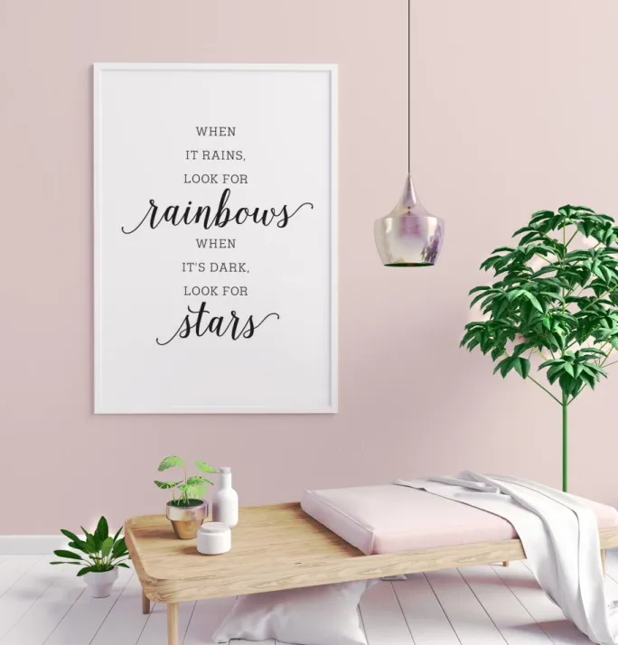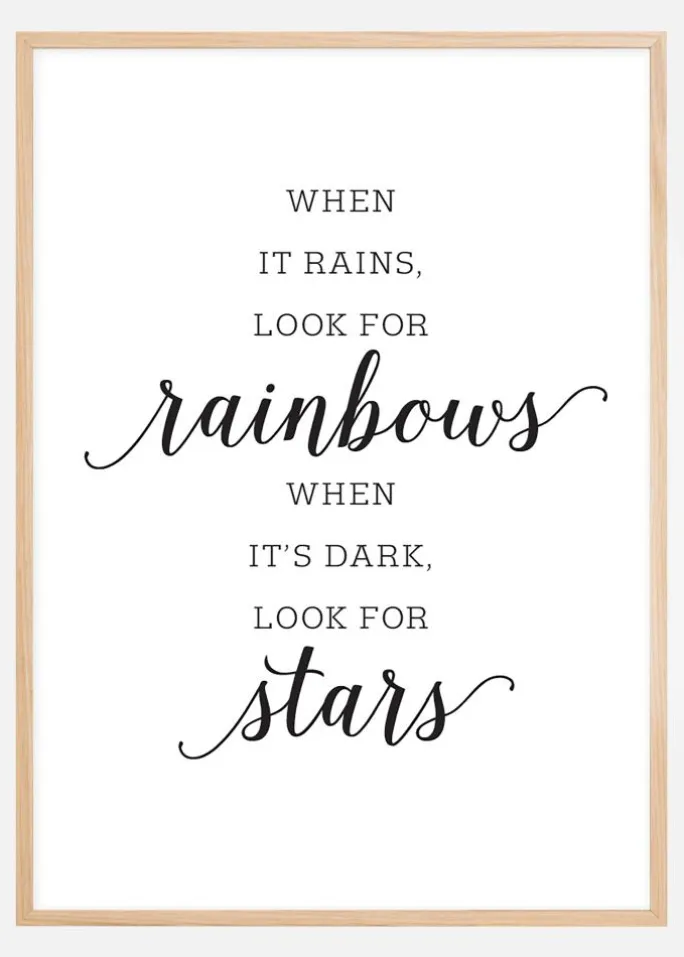Et inspirerende print med et stærkt citat, som bør være den måde, du lever dit liv på. Når det regner, kig efter regnbuer, når det er mørkt, kig efter stjerner. Ord til at leve efter i dette enkle sort/hvide print. Nyd dette og se på den lyse side af livet, uanset hvornår på dagen du stopper op for at læse dette.
