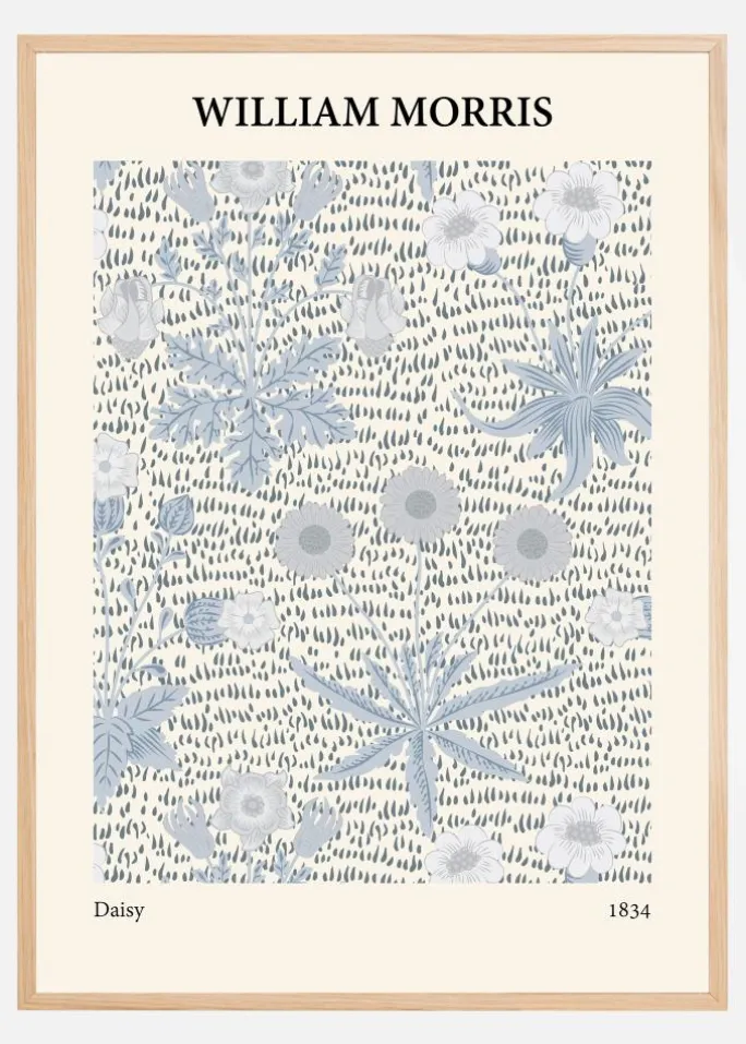 Denne fortryllende plakat viser William Morris’ klassiske mønster “Daisy” fra 1834. Det er et delikat og charmerende design, der er kendetegnet ved dets blå nuancer og yndefulde gengivelse af blomsten, som den er opkaldt efter. De subtile accenter af grønt blandt bladene giver liv til den lyse og luftige baggrund, hvilket gør dette til et tidløst design, der stadig er elsket i dag.