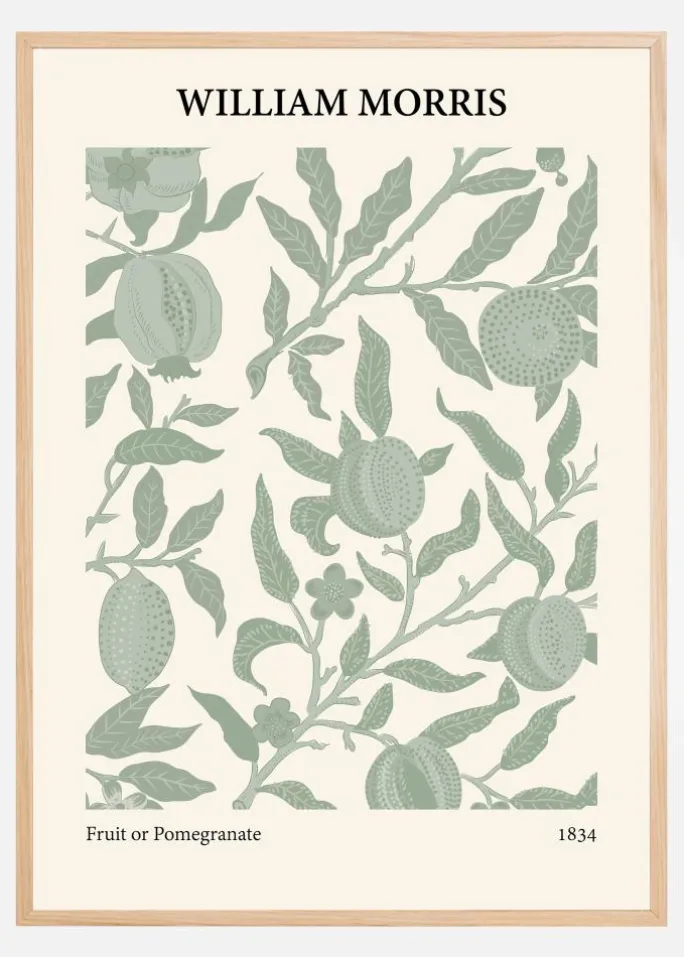 Denne distinkte William Morris-plakat, med navnet “Fruit or Pomegranate”, fanger beskuerens opmærksomhed med sit omhyggeligt arrangerede mønster af frugt og løv. Kunstværket fremstår både forfriskende og tidløst, med sin farvepalet i beroligende grønne nuancer mod en mild cremefarvet baggrund. Granatæblets unikke form og struktur fanges op af kontrasterende mørkere grønne blade, hvilket skaber en behagelig rytme og visuel dybde i designet. Dette er en plakat, der bærer en stærk forbindelse til naturen og dens rige skønhed.