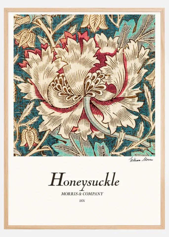 Denne plakat præsenterer “Honeysuckle”, et udsøgt mønster af William Morris, skabt for Morris & Company 1876. Mønstret er en rig væv af blomster, med kaprifoliens svejende kurver og blomster i smukke nuancer af rødt, creme og blå. Baggrunden, i en dybere blå tone, fremhæver de elegant formede blomster og blade, og skaber en dyb og kompleks komposition, der er både iøjnefaldende og tidløst smuk.