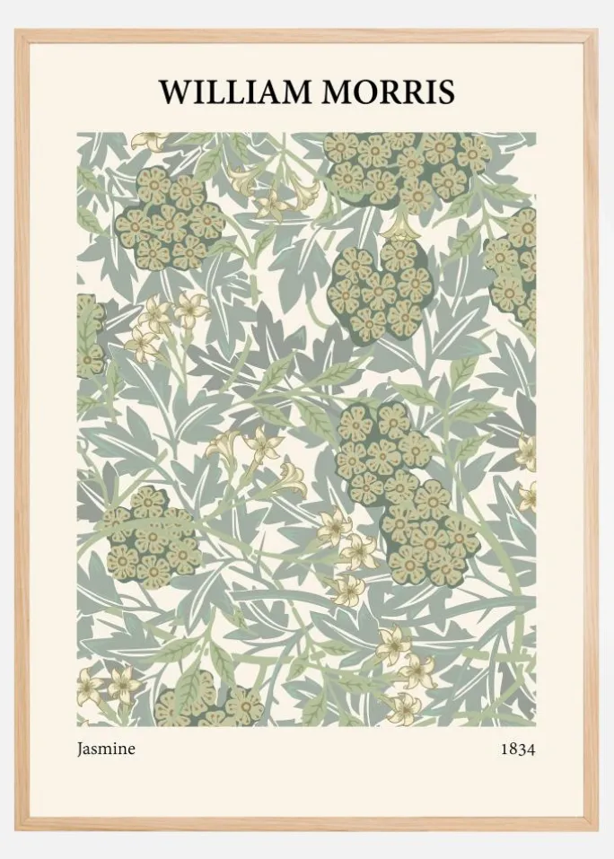William Morris’ “Jasmine” plakat er en fremvisning af både det delikate og det dynamiske i naturens flora. Dette print er levende med sit flydende mønster af jasminblomster og frodigt løv. Mønsteret er komponeret med en sofistikeret farvepalet i grønt, beige og gult, som sammensmelter for at skabe en følelse af en tæt og indbydende have, klar til at udforskes og beundres.