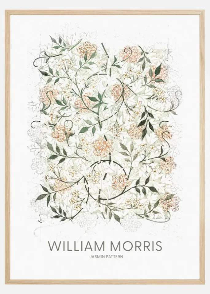 Denne udsøgte plakat præsenterer “Jasmin Pattern”, endnu et tidløst værk af den berømte designer William Morris. Mønstret er en dejlig komposition af jasminblomster og løv, fremstillet med en finesse og opmærksomhed på detaljer, som er karakteristisk for Morris. Farveskemaet er en blød og naturlig palette, hvilket fremhæver blomsterens delikate former og bladene mod en rolig baggrund.