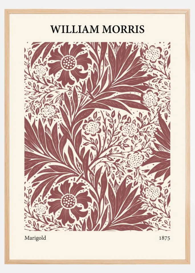 Denne plakat præsenterer en dristig og smuk fortolkning af William Morris’ “Marigold” fra 1875. Dets indviklede mønster af blade og blomster, i rige toner af terrakotta og cremehvidt, reflekterer den kunstneriske passion og håndværksmæssighed, som Morris lagde i hvert stykke af sit arbejde. Dette er et mønster, der har modstået tidens prøve og fortsætter med at være lige så relevant og beundret i dag, som da det først blev skabt.
