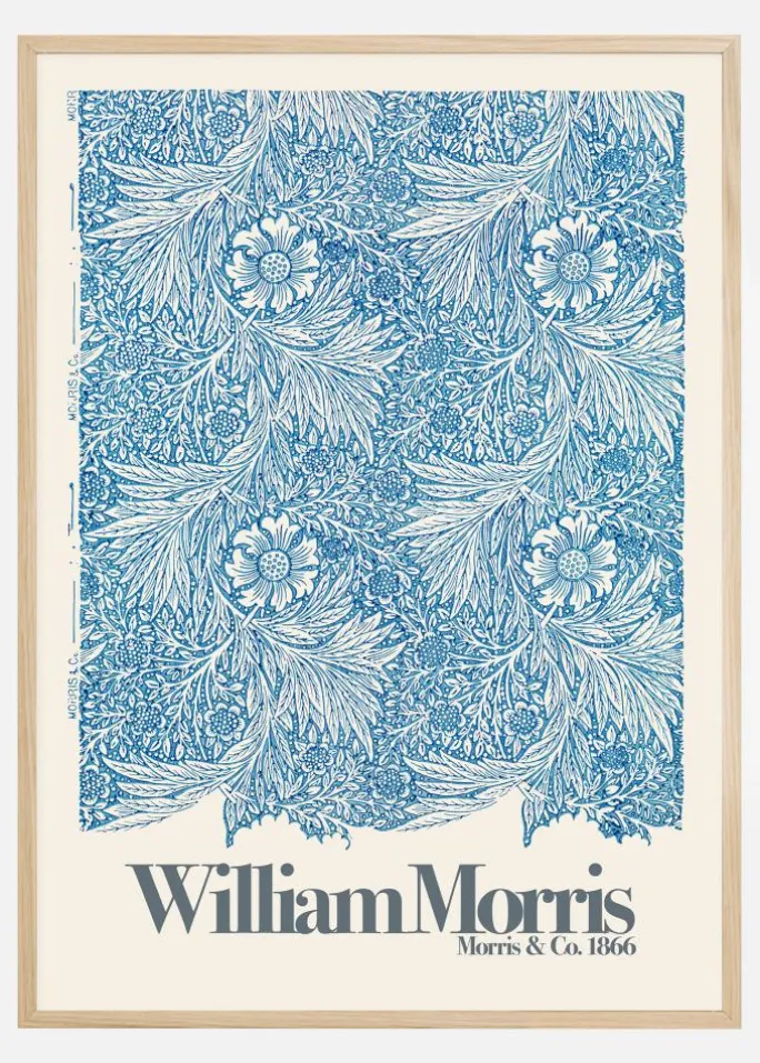 Denne plakat viser et klassisk William Morris-mønster med navnet “Marigold”, skabt af Morris & Co. omkring 1866. Det ikoniske mønster, kendt for sine indviklede og naturinspirerede elementer, er fremstillet i en dybblå farve mod en ren, cremefarvet baggrund. Hver detalje i blomsterarrangementet er omhyggeligt udskåret, hvilket viser Morris’ sans for skønhed i det naturlige og en evne til at omdanne det til kunstværker, der er tidløse og elskede den dag i dag.