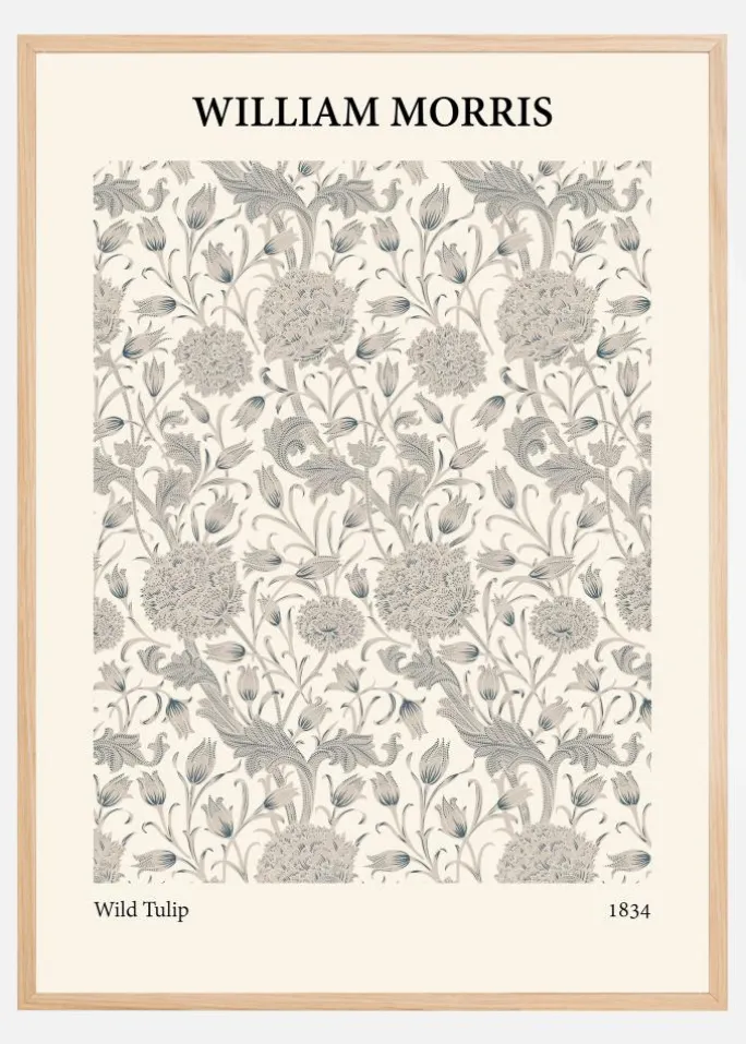 Denne William Morris-plakat, kaldet “Wild Tulip”, er en elegant fortolkning af vilde blomster, sammensat med stor dygtighed og omhu. Mønsteret er en labyrint af tulipaner og blade, udført i subtile nuancer af beige og gråt mod en varm, cremefarvet baggrund, hvilket gør det til et ideelt værk for dem, der ønsker at skabe en afslappet og sofistikeret atmosfære. Detaljrigdommen i illustrationerne demonstrerer Morris’ mesterlige hånd og hans evne til at forvandle hverdagsudsigter til kunst.
