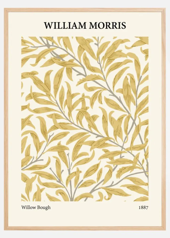 Denne elegante og varme plakat præsenterer William Morris’ “Willow Bough” fra 1887 og fanger den umiskendelige karakter af Morris’ design med dets livlige pileblade. Mønsteret i gyldne og beige nuancer mod en lys baggrund skaber en fornemmelse af solskin og varme og bringer et victoriansk strejf af skønhed og finess til moderne hjem.