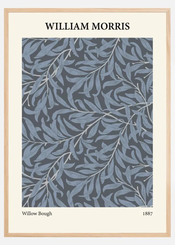 Denne plakat er en smuk gengivelse af William Morris design “Willow Bough” fra 1887, som forestiller pilebladets yndefulde form i en sofistikeret palette af blågrå nuancer. Dette mønster er et fremragende eksempel på Morris’ evne til at kombinere æstetik med naturmotiver, hvilket skaber et roligt og indbydende indtryk, der passer til mange forskellige indretningsstile.