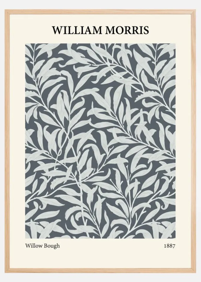 Denne stilrene plakat afbilder William Morris’ velkendte mønster “Willow Bough” fra 1887, et mønster, der fortsat fascinerer med sit tidløse design. Det har en sofistikeret palet af dybe blå og lyse grå nuancer, hvilket skaber en fornemmelse af både modernitet og klassisk elegance. Hvert pileblad er skildret med den nøjagtighed og kærlighed til detaljer, som Morris er berømt for.