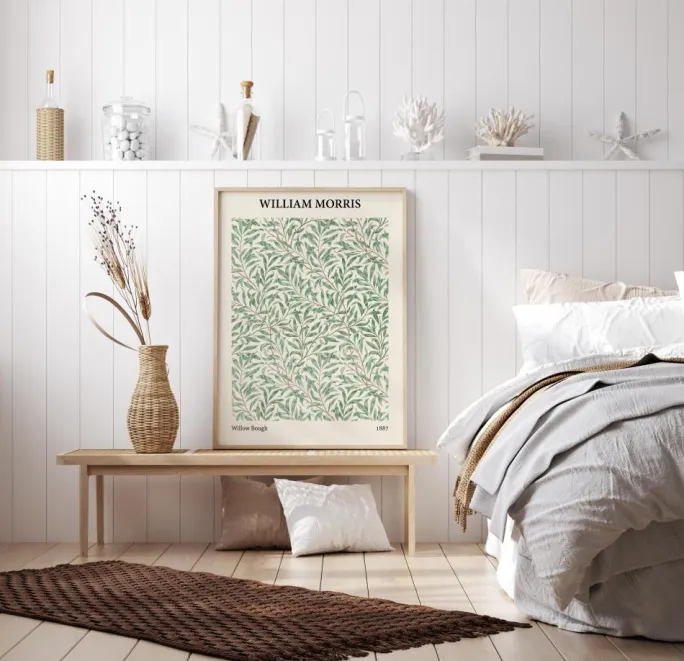 En mønstret plakat af et William Morris-tryk med pilebærbuske. De enkle grønne blade fylder printet, og hver enkelt er forbundet med tynde grene for at skabe et indviklet mønster i hele billedet. Tilføj dette til en pastelfarvet væg for at få noget lidt anderledes.