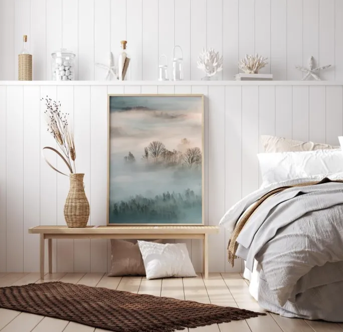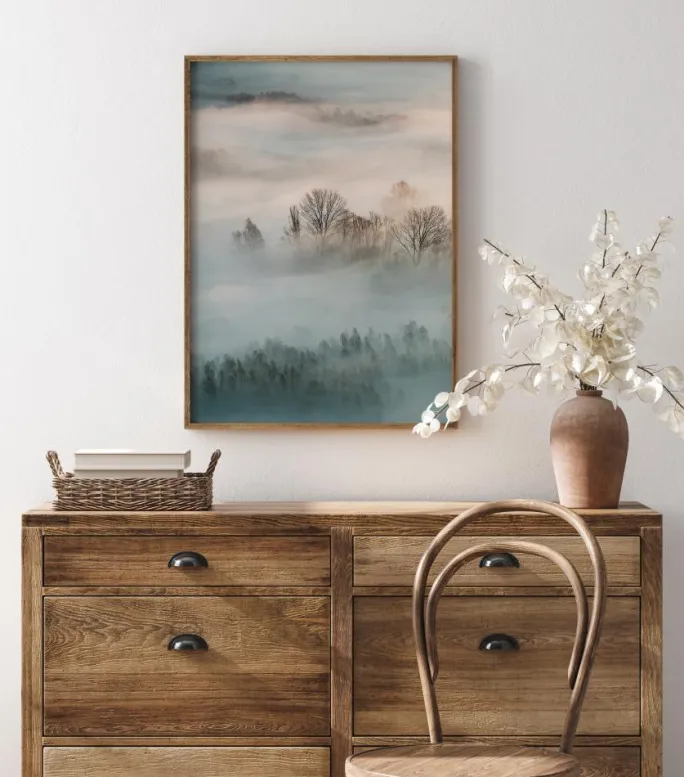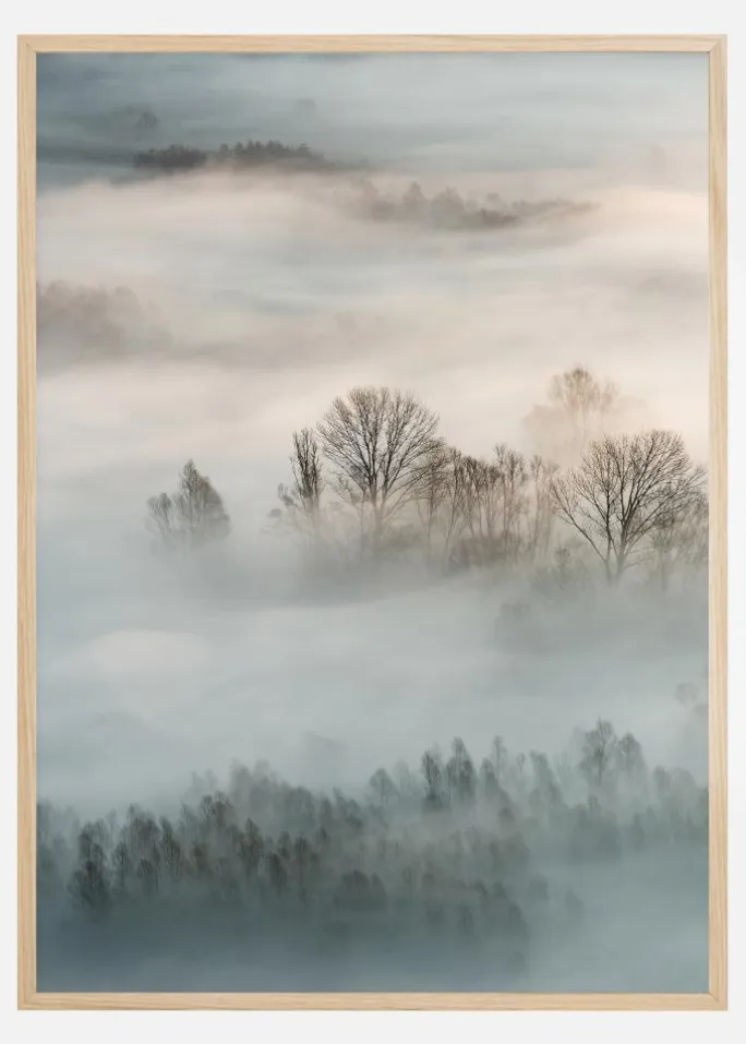 Et magisk print af et tåget landskab med en skov. Tåge dækker det meste af landet med træer, der dukker op her og der som små øer i tågen. Et blødt lyserødt lys gennemsyrer tågen og skaber en varmere følelse i dette næsten fantasiland.