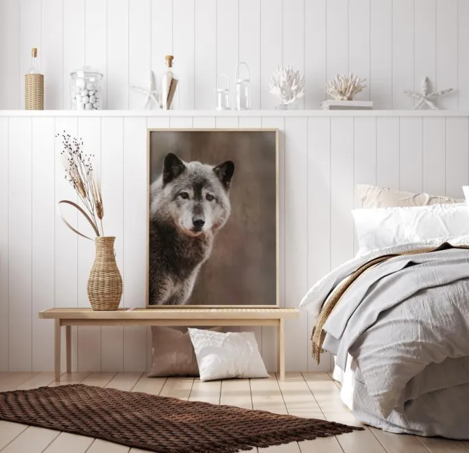 En plakat af en grå skovulv, der stirrer ud mod kameraet. Ulven har dog et blødt udtryk i ansigtet, der næsten ligner en hunds udtryk. Baggrunden er sløret og blød, men skaber en følelse af vildmarken og de forestående kolde årstider. Sæt dette billede på din væg, og kom tættere på naturen.
