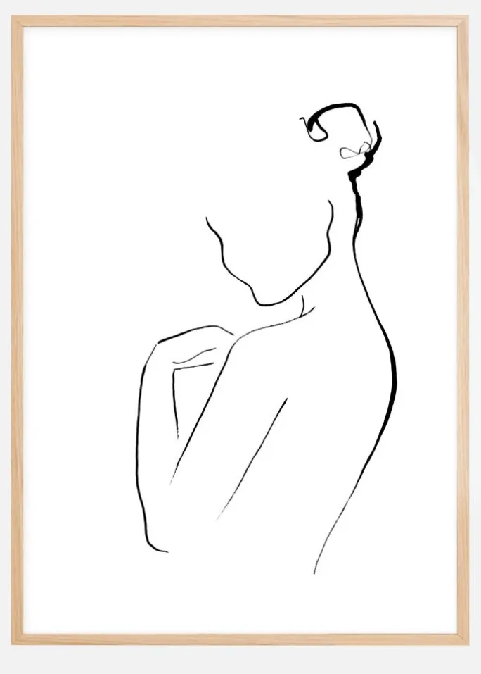 Smukt sprød linjekunst af en kvinde tegnet i tusch, skabt af kunstner Cora Eklund, Cora Konst & Illustration. En enkel og stilren plakat som passer til de fleste hjem og indretningsstile og som i sit udførelse er let at kombinere med andre favoritter på en større billedvæg.