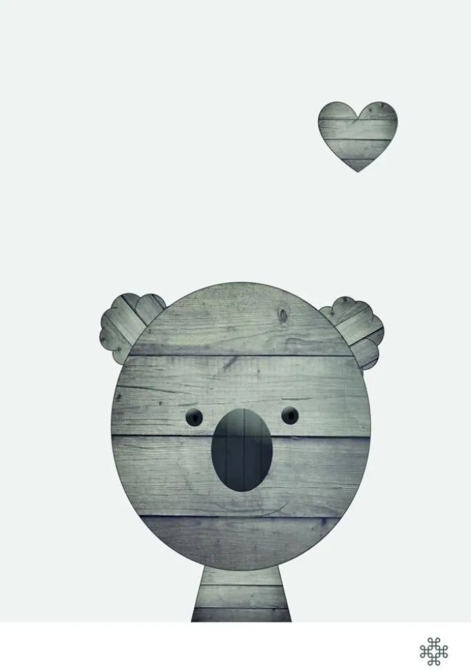 En sort/hvid plakat af en koalabjørn lavet af billeder af trækorn. Over den grå koala er der et lillebitte hjerte med samme træstruktur. Denne søde lille bjørn giver dig al den kærlighed og er en fantastisk tilføjelse til ethvert værelse for at få den kærlige følelse.