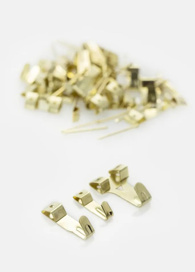 Har du et antal lettere billeder eller vægdekorationer som du hurtigt og enkelt vil hænge op på en trævæg? I så fald passer disse smarte x-kroge med tilhørende søm udmærket. Krogene og sømmene er dækket af messing og levereres i en pose med 25 styk.