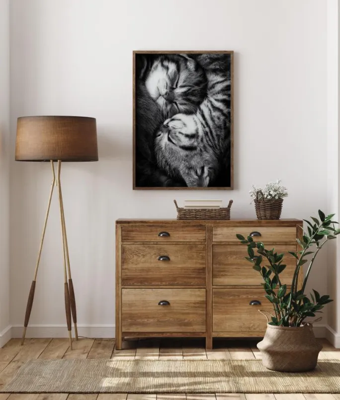 En sød dyreplakat med to kattekillinger, der ligger sammenkrøbet og sover. Tag dette print med hjem og nyd følelsen af et kram, når du ser på de nuttede katte, der ligger sammen.