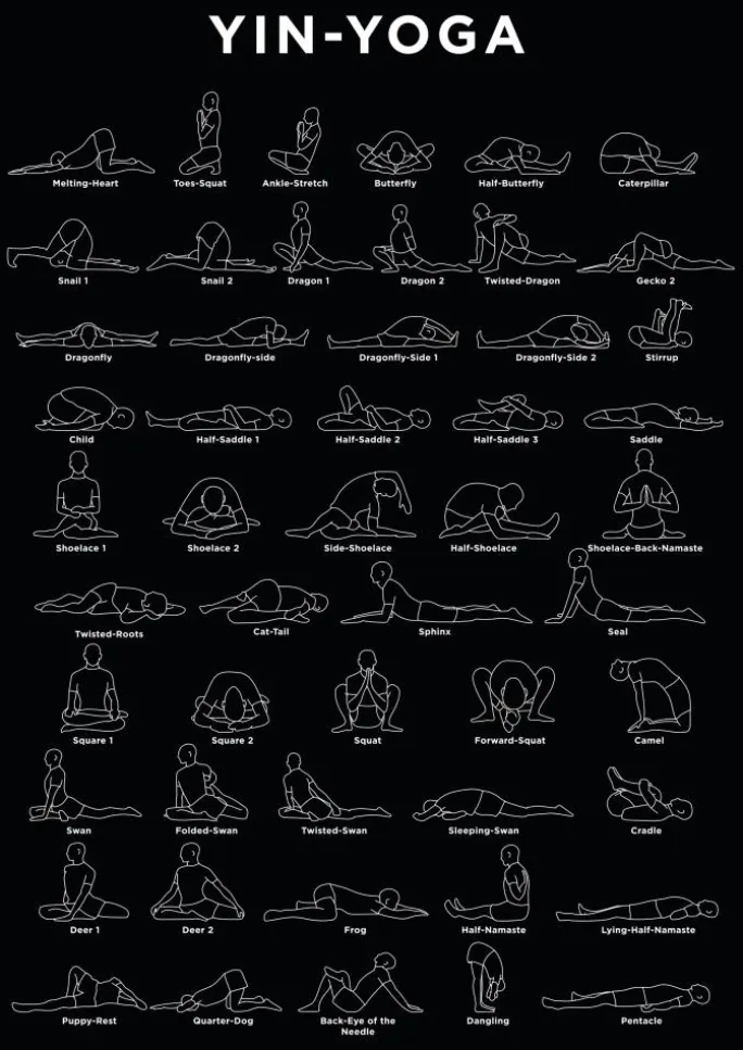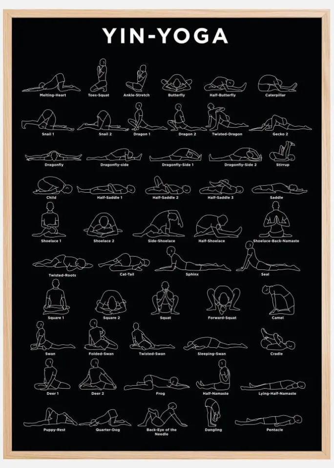 En nyttig plakat med de forskellige stillinger, du kan lave i yoga. Tag et kig på denne sorte plakat med hver yin-yogapose tegnet som en simpel hvid figur. Lær de forskellige stillinger med lethed, da den lille figur viser dig, hvordan du skal gøre dem. Bliv smidig i år, når du begynder at strække dig takket være dette print!