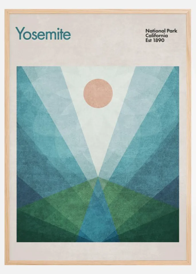 Denne plakat fanger ånden af Yosemite National Park med et geometrisk design, der afspejler parkens majestætiske og ikoniske landskaber. Med en farvepalette, der minder om klare himle og frodige dale, hylder teksten “Yosemite National Park California Est 1890” parkens lange historie som en nationalpark og en naturens skat.