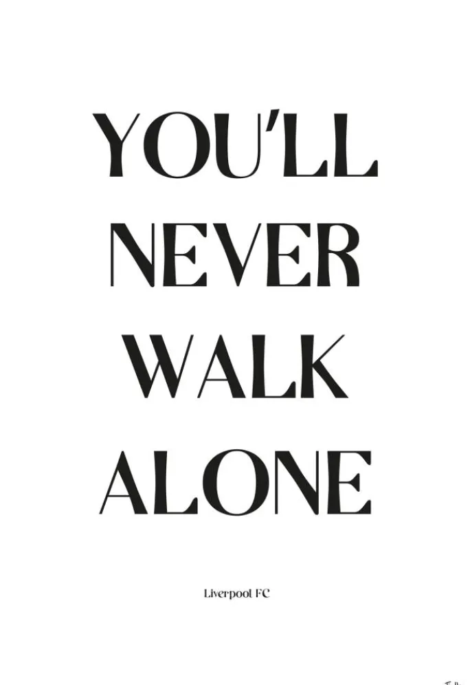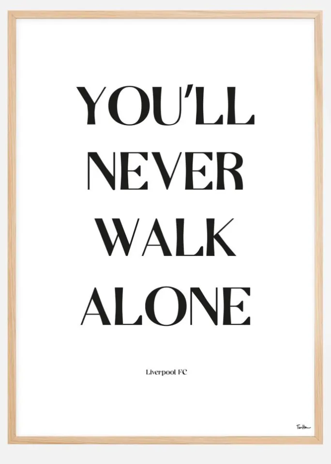 En tankevækkende plakat med et vigtigt citat om livet. You’ll Never Walk Alone fra Liverpool FC er den perfekte tilføjelse til hjemmet for enhver fodboldfan. Men det er også et fantastisk motiverende citat i sig selv for dem, der har brug for en hjælpende hånd.