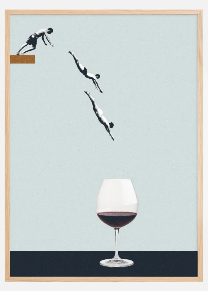 Denne fascinerende og dynamiske plakat fanger tre dykkere i sekventiel bevægelse mod et ventende vinglas, et motiv fyldt med bevægelse og elegance. Hver figur er fanget i en anden fase af dykket, hvilket skaber en følelse af tid og handling, der udvikles. Dette billede repræsenterer måske en flugt fra det daglige, et håbefuldt dyk ind i de glæder og muligheder, livet tilbyder, ligesom vinen, der venter i glasset.