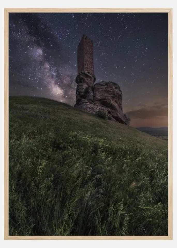 En storslået plakat af slottet Zafra om natten. Se op til denne gamle stenstruktur fra bunden af en græsklædt bakke. Tårnet rækker op mod nattehimlen, hvor Mælkevejen bøjer sig over himlen. Dette smukke billede vil se godt ud på enhver væg i dit hjem og tilføjer også et strejf af det magiske.