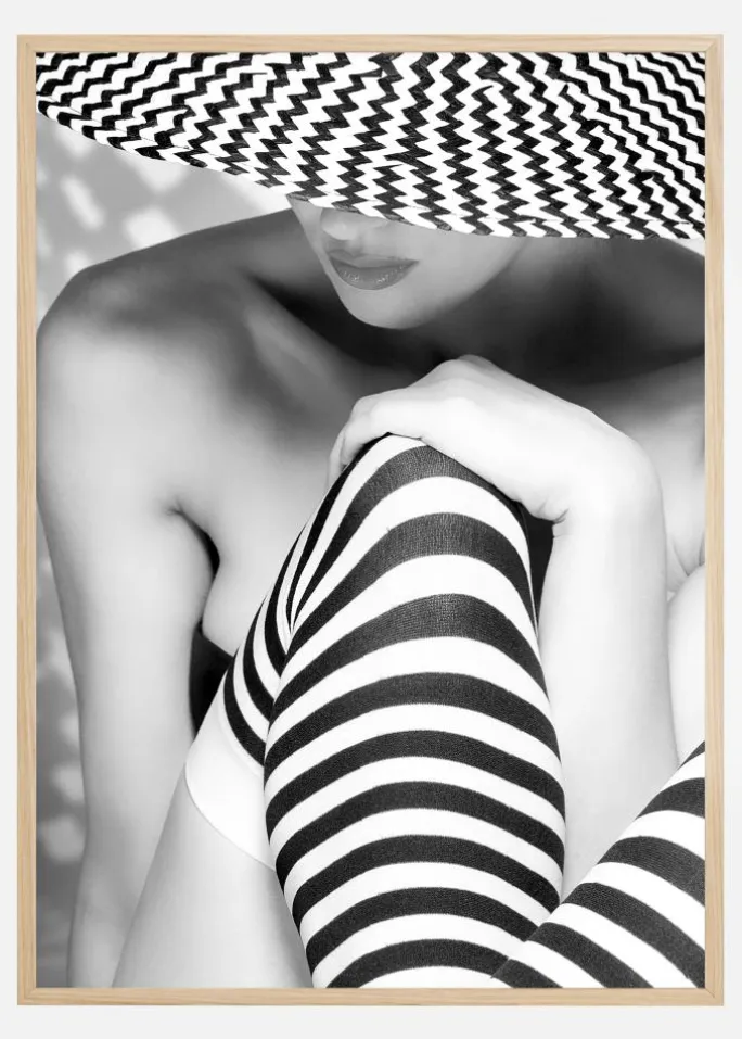 En geometrisk portrætplakat af en kvinde iført en mønstret hat og stribede strømper. Hun læner sig fremad med den ene hånd på knæet. Hendes ansigt er skjult af hattens mønster i dette iøjnefaldende billede. Sæt dette sammen med et strejf af farver på din væg, og se mønstrene eksplodere.
