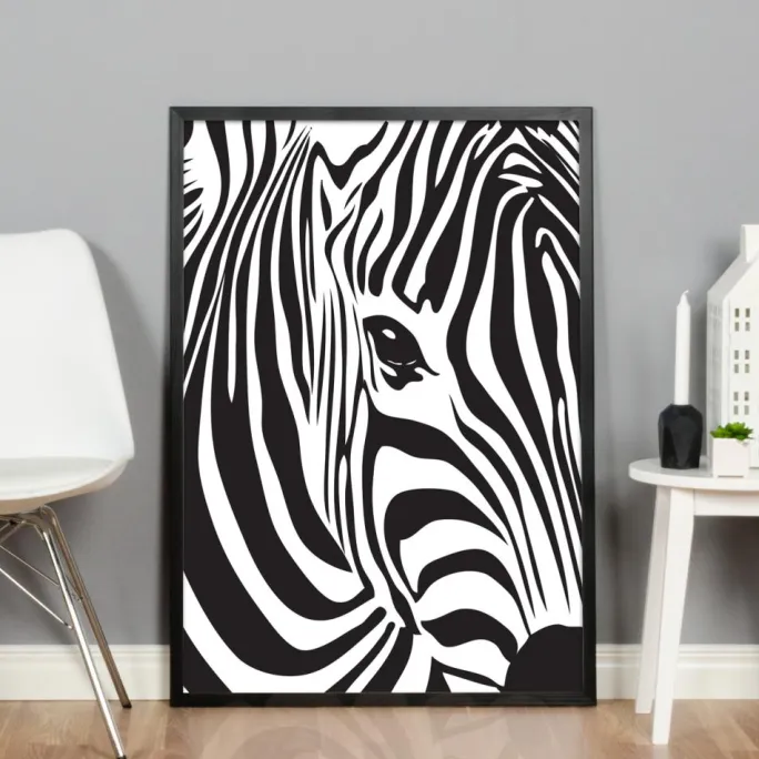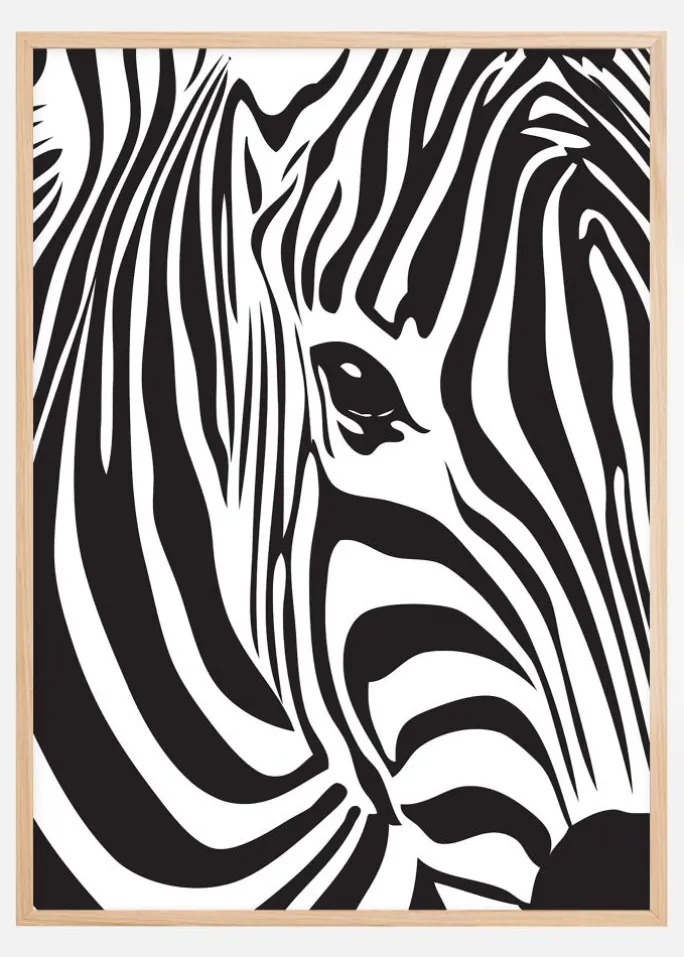 Grafisk plakat med et nærbillede af en zebra. Plakaten passer rigtig godt til at blive hængt op som en del af en billedvæg med vilde dyr, både i form af illustrationer og fotografier, som bliver et blikfang i rummet. Det stilrene grafisk sort-hvide motiv gør, at plakaten gør sig lige så godt i hjemmet som i offentlig miljø. Kombiner posters med en sort billedramme med smal profil for at fremhæve zebramønstret på bedste vis.