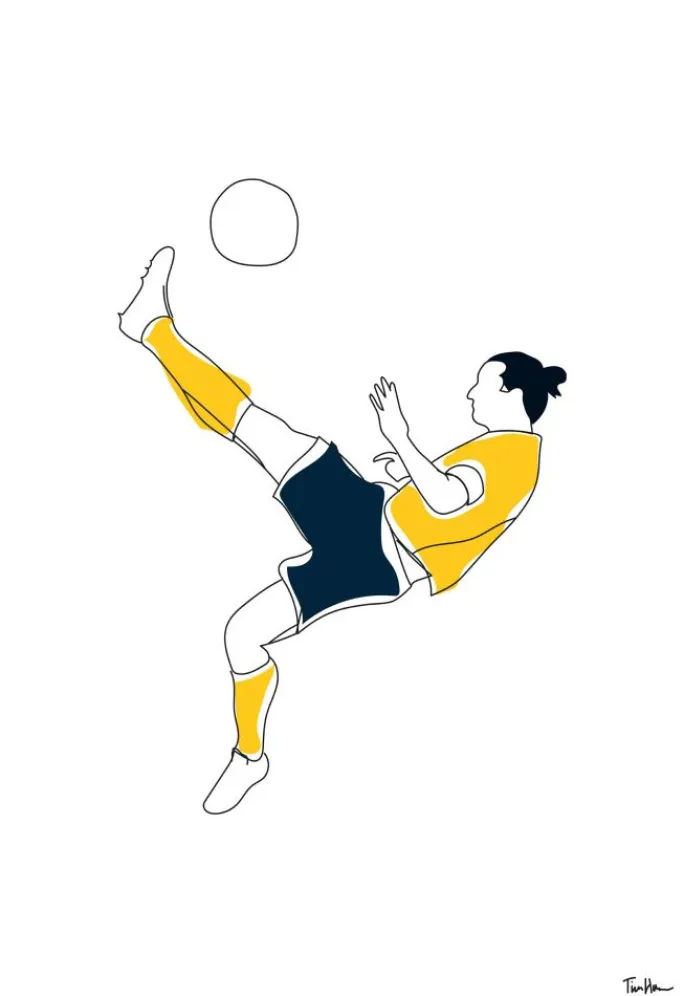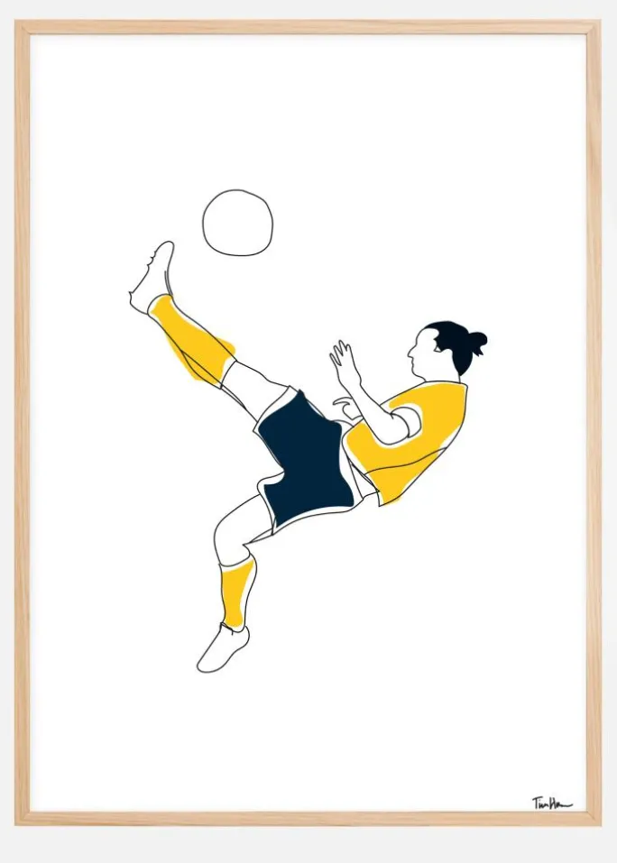 En fodboldplakat med et stiliseret billede af Zlatan Ibrahimovic, der sparker til en fodbold. Spilleren er iført en gul top og sokker med marineblå shorts. Han læner sig tilbage og sparker med benet højt op i luften, mens fodbolden sejler op. Fejr din kærlighed til fodbold med dette enkle, men effektive design.