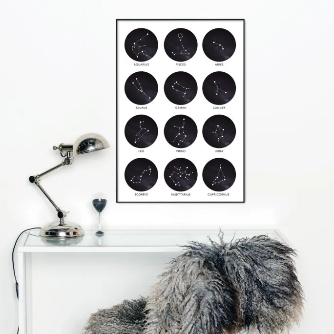 Giv en plakat med stjernetegn til en du holder af eller forkæl dig selv med noget fint. Denne stilfulde posters har motiver af alle stjernetegnene, og under motiverne står tegnenes navne på engelsk. Glem ikke at vælge en matchende ramme til din plakat!