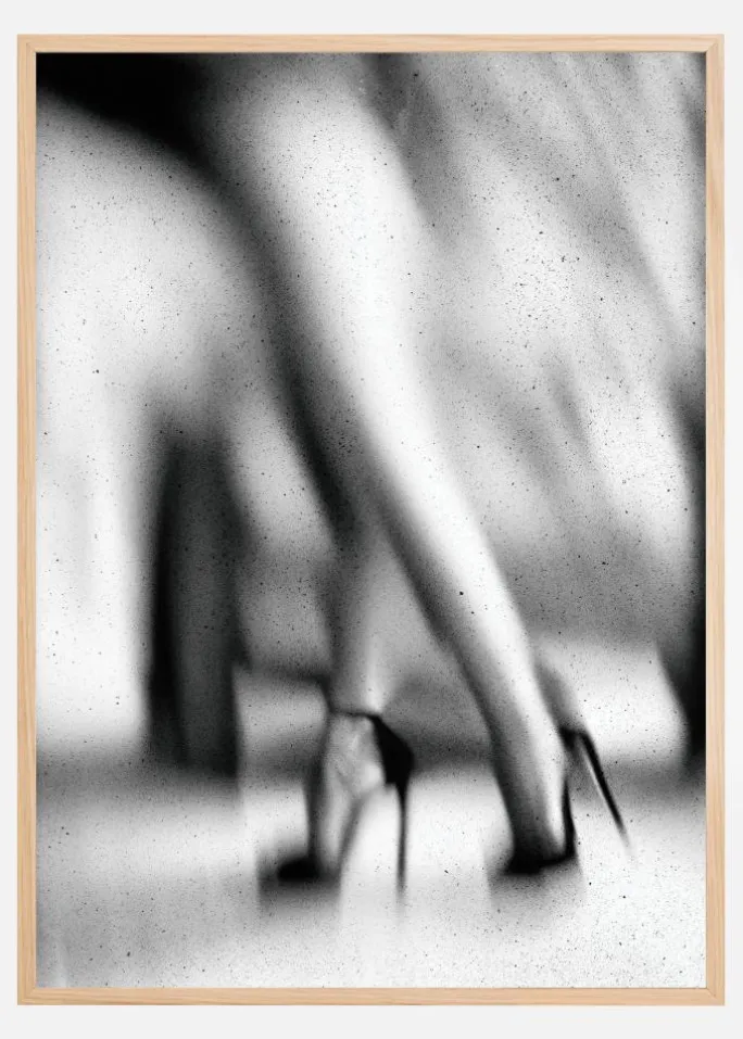 Denne kunstneriske plakat leger med sløring og kontrast for at skabe en følelse af bevægelse og abstraktion. Den afbilder et par ben i højhælede sko i en atmosfærisk og næsten sløret bevægelse, hvilket giver værket en æterisk og dynamisk følelse. Plakatens monokrome farveskala fremkalder en følelse af både tidløshed og modernitet.
