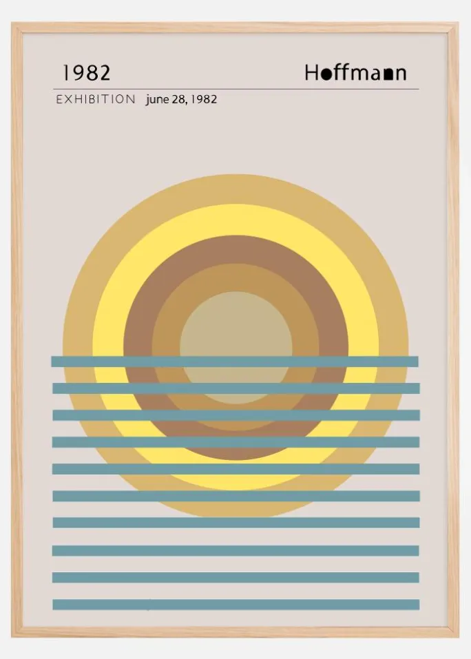 Denne stilfulde og konceptuelle plakat er en hyldest til Hoffmanns udstilling fra 1982. Den viser en serie af overlappende cirkler og linjer, der skaber en illusion af en solnedgang over vandet. Farvepaletten er varm og indbydende, med toner af guld, gul og brun, der kontrasterer mod kolde blå nuancer, hvilket formidler en følelse af balance mellem dag og nat, varme og kulde.